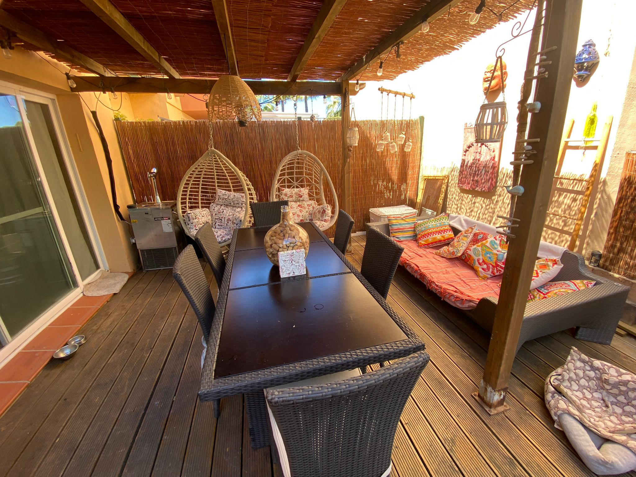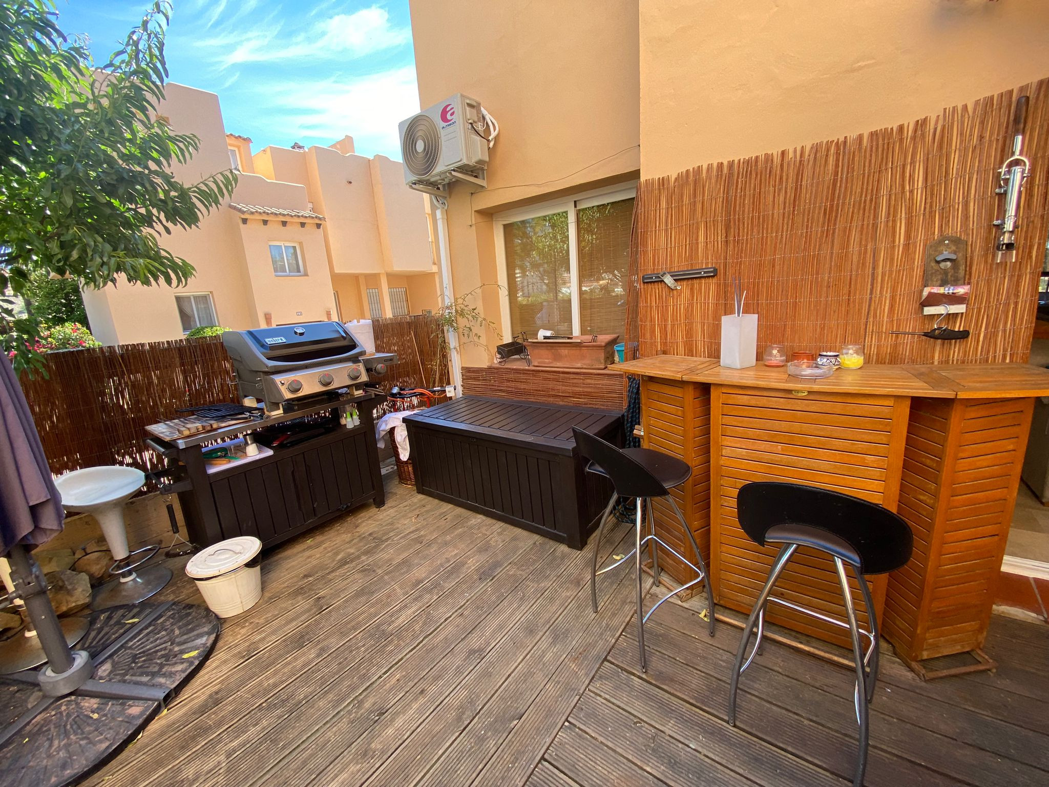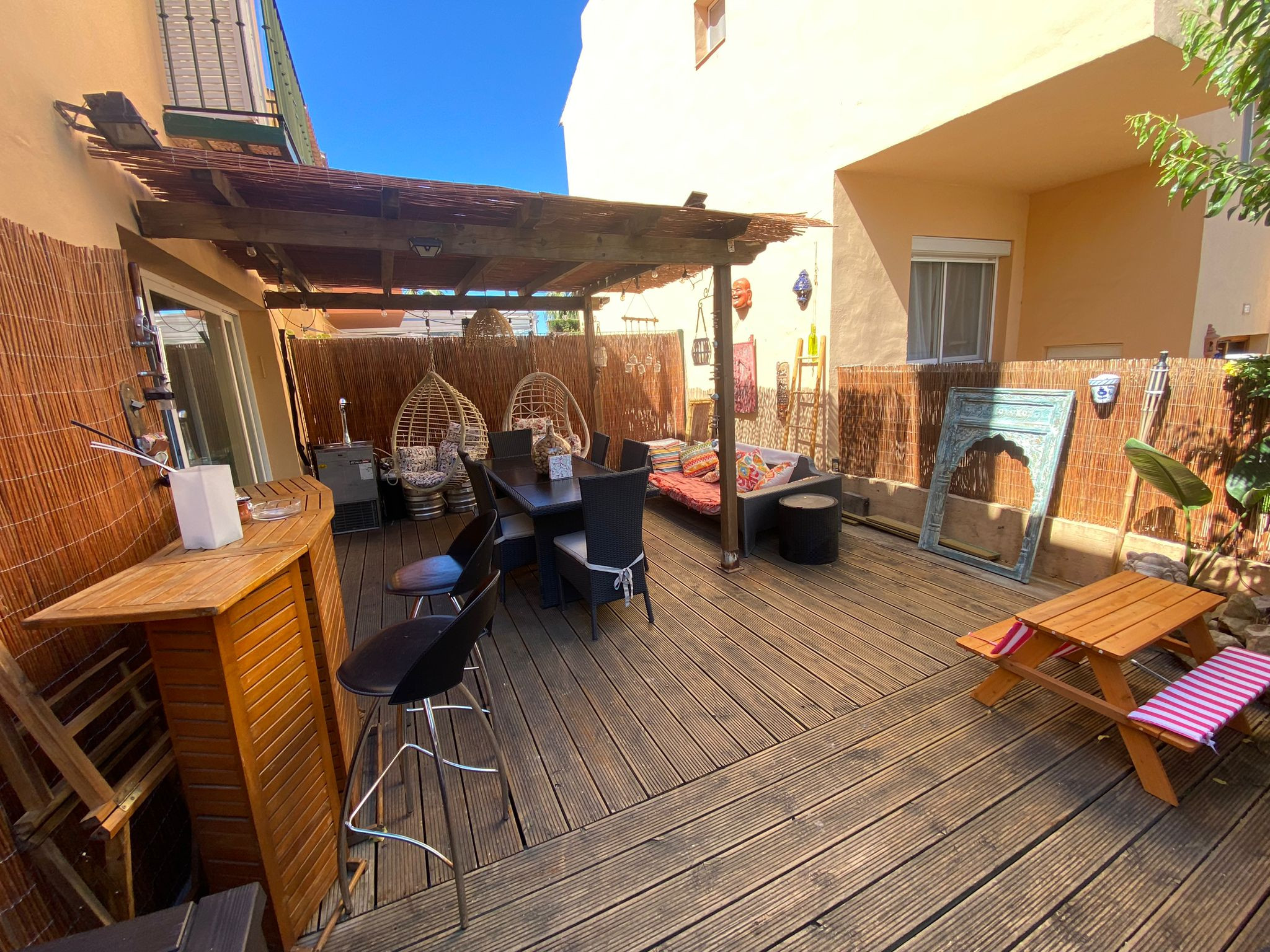 Welcome to this exquisite 4-bedroom Cozy townhouse located in the prestigious Urbanización Condes de Iza. Situated within this gated community, you'll have access to two communal pools, providing a refreshing retreat during your stay. With its spacious layout and desirable amenities, this property offers an ideal vacation destination. The Space - Spanning across 170 m2, this townhouse offers ample space for up to 8 people to comfortably unwind. - The living room welcomes you with its generous size, perfect for relaxing and spending quality time with your loved ones. - To enhance your experience, step outside into the beautiful garden, complete with a table and BBQ Grill where you can savor the afternoon sun and enjoy outdoor meals. - Adjacent to the living room, you'll find a lovely kitchen, fully equipped with modern appliances such as a dishwasher, hot water kettle, oven, microwave, toaster, freezer, stove, and refrigerator. - Additionally, the kitchen is stocked with cooking utensils, wine glasses, and trash cans, ensuring convenience during meal preparation. - The dining table provides a charming setting for enjoying your culinary creations. - The townhouse boasts four beautifully appointed bedrooms, accommodating a total of eight guests. - The first, second, and third bedrooms feature queen-size beds, while the fourth bedroom offers two single beds, providing flexible sleeping arrangements. - For your comfort and convenience, there are two bathrooms one with a shower and the other with bathtub, as well as an additional guest toilet. - Toiletries including cleaning products, conditioner, shampoo, soap, towels, toilet paper, hot water, and a hairdryer are all thoughtfully provided. - Your safety is of utmost importance, and as such, the townhouse is equipped with essential safety equipment, including a fire extinguisher, carbon monoxide detector, smoke alarm, and a first aid kit. - Stay connected with the complimentary Wi-Fi access, and enjoy the comfort of central air conditioning throughout the property. - For your convenience, a washing machine, iron, drying rack, and hangers are available. The townhouse also offers superior quality linens, ensuring a comfortable and restful sleep. Guest Access Enjoy the prestigious Urbanización Condes de Iza, a stunning residential development located in the vibrant city of Marbella. Nestled in the heart of the Costa del Sol, this gated community offers a luxurious and secure living environment for its residents and visitors. Urbanización Condes de Iza is renowned for its exceptional amenities and elegant surroundings. As you enter through the gates, you'll be greeted by beautifully landscaped gardens, well-maintained walkways, and a sense of tranquility. The community is meticulously designed to provide a peaceful and relaxing atmosphere, allowing residents and guests to unwind and enjoy their surroundings. One of the highlights of this urbanization is the presence of two communal pools, inviting you to take a refreshing swim or soak up the sun in style. Whether you prefer to lounge poolside with a book or engage in invigorating water activities, these pools offer a fantastic way to enjoy the warm Mediterranean climate. Safety and security are paramount at Urbanización Condes de Iza, ensuring peace of mind for all residents and guests. With controlled access points and 24-hour security personnel, you can feel at ease knowing that your well-being is well taken care of. Getting Around The location of Urbanización Condes de Iza is another notable advantage. Situated in close proximity to the vibrant city of Marbella, you'll have easy access to a wide range of amenities, entertainment options, and cultural attractions. From world-class restaurants and upscale boutiques to picturesque beaches and renowned golf courses, Marbella offers a diverse array of experiences to suit every taste. Additionally, the urbanization's proximity to Puerto Banús adds an extra touch of glamour and excitement to your lifestyle. This glamorous marina is famous for its luxury yachts, high-end fashion boutiques, and bustling nightlife. Whether you're seeking a night of fine dining, dancing at exclusive clubs, or simply enjoying a leisurely stroll along the waterfront, Puerto Banús offers endless entertainment possibilities. Urbanización Condes de Iza also benefits from its close proximity to the Real Club Padel de Marbella, a prestigious sports club where you can engage in paddle tennis, socialize with fellow sports enthusiasts, and enjoy a range of recreational activities. Within walking distance of the urbanization, you'll find convenient shopping options, making it easy to access everyday necessities without having to travel far. However, due to its central location between Marbella and San Pedro, having a car is recommended for exploring the surrounding areas. Taxis and Uber services are also readily available and provide a convenient transportation option. Other details to note - The cleaning fee is included in the total price. - High chairs and cribs can be provided free of charge, upon request. - The pool will only be open from June 01 to September 05.
